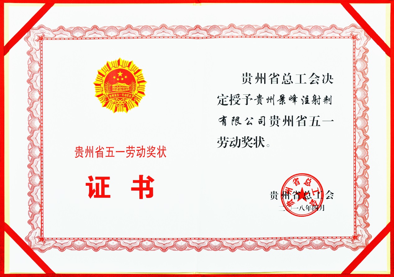 近日,在贵州省庆祝2018年“五一”国际劳动节暨表彰大会上,贵州景峰注射剂有限公司被省总工会授予贵州省“五一劳动奖状”荣誉称号。