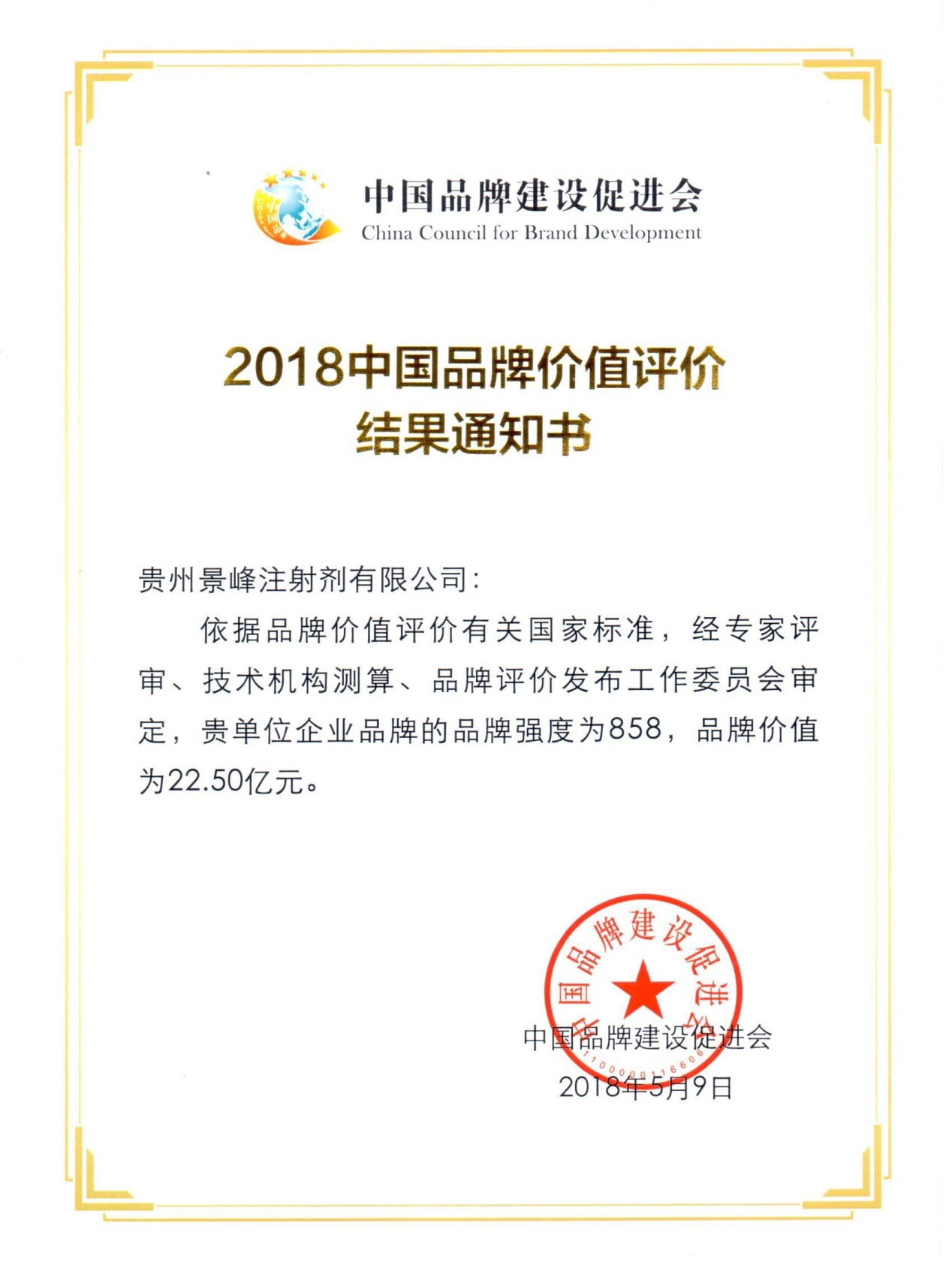 “2018中国品牌价值评价信息发布暨第二届中国品牌发展论坛”在上海举行,作为第二个“中国品牌日”重要品牌活动,国家市场监督管理总局相关领导、众多知名企业家以及国内外权威品牌专家等参加论坛。经权威发布,贵州景峰注射剂有限公司企业品牌强度858,品牌价值评定为22.50亿元。