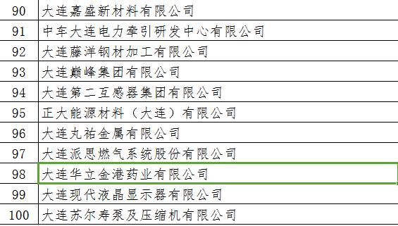 2018年10月29日,大连市企业联合会发布了“2017年度大连市企业百强榜名单”,大连华立金港药业荣登百强排行榜(第98位)。
