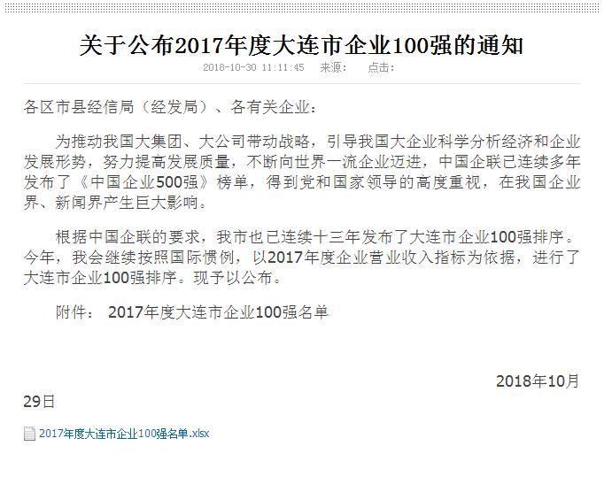 此次百强榜排名是以2017年大连市企业销售收入为主要指标,同时参考净利润、资产总额,纳税总额和研发费等指标,经专家团队多次审核最终评定。