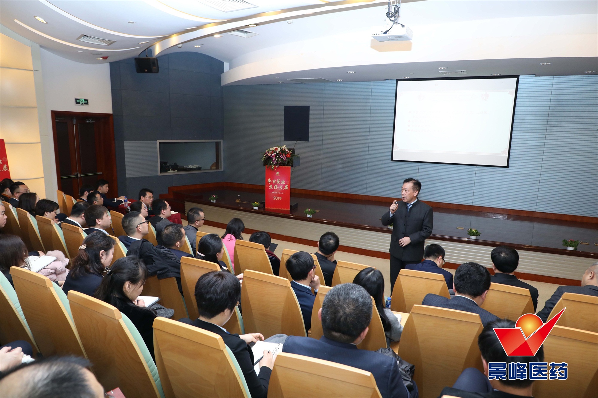 上午9点整,叶总发表了“生存·基础·发展”为主题的讲话,为本次大会拉开序幕。叶总表示,“生存”就是活下来,一定勇敢地面对困难;在克服困难的同时要为“基础”奋进,要认真打好“基础”;抓住机遇,冷静分析,为未来战略“发展”奠定根基。讲话内容分为三个大板块,叶总围绕“2018年工作总结”、“景峰的过去十年”和“2019年经营目标——顺势而为,乘势而上”进行了两小时的发言。第一板块中,叶总对2018年各子公司的重点产品生产任务完成情况、生产质量体系的重塑、国际化项目合作、生物药车间建设、销售改革情况、销售经营模式、研发管线梳理、优化公司投资者关系进行点评总结。第二板块中,叶总回顾了过去十年景峰销售回款情况、人均贡献值,并强调各位干部每做一件事都要踏踏实实,计划并实现工作目标,证明自己是如何高效工作的。